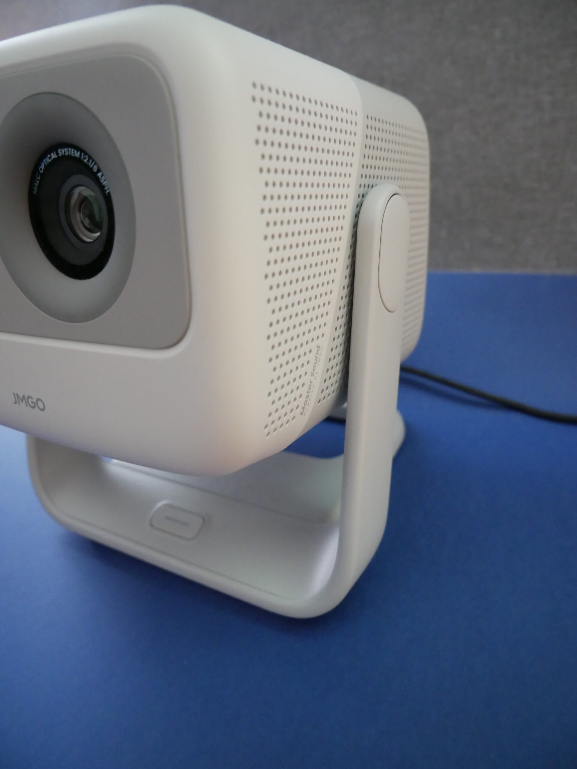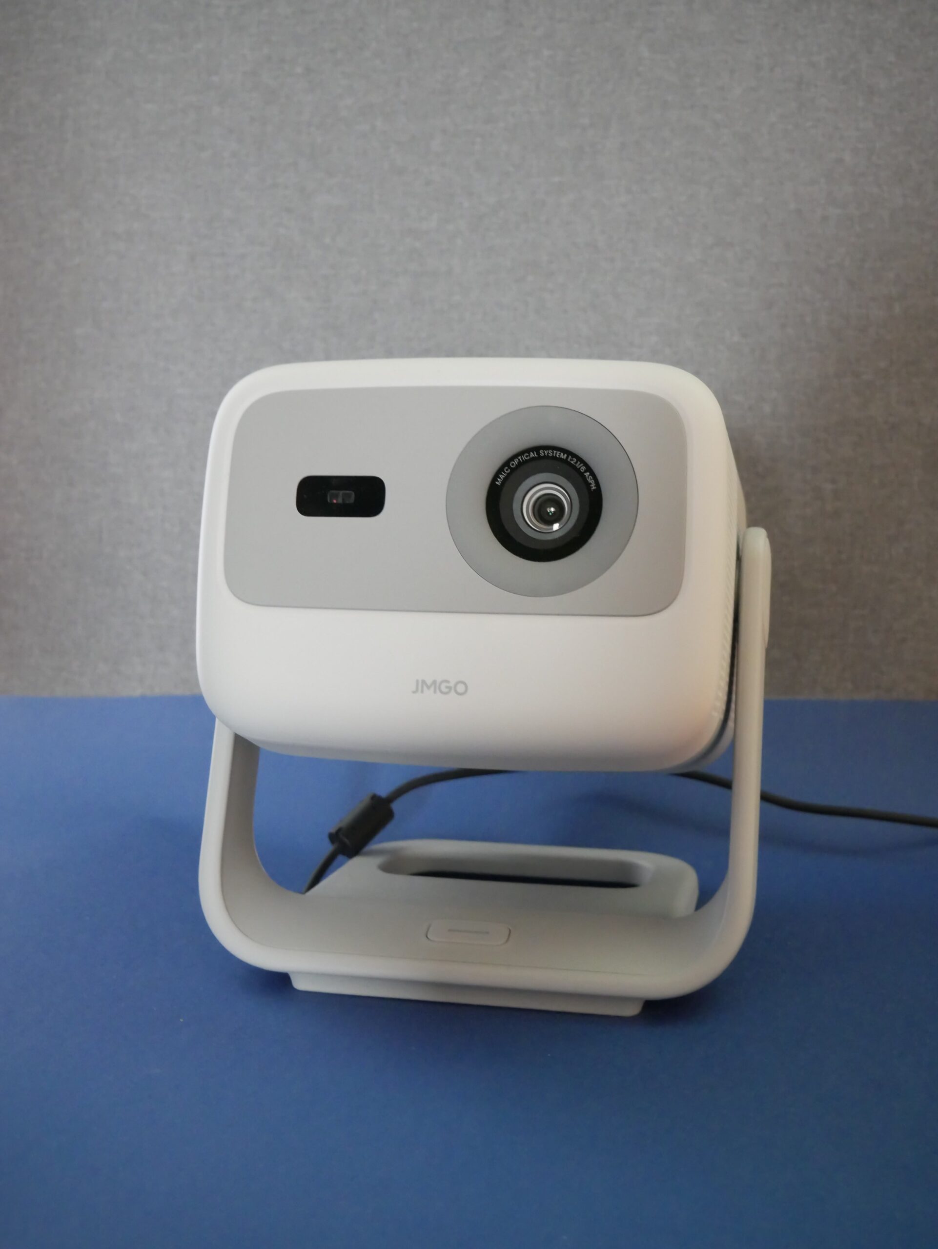 Waży 1,8 kg, co oczywiście sprawdziłam (dokładnie 1860g), ma rozmiary 18,7 x 16,5 x 19,1 cm. Nic Ci to nie mówi? Oznacza to, że spokojnie przeniesiesz go z salonu do sypialni, na taras czy nawet na pokaz filmu z wakacji do znajomych. Gimbal z zakresem 127° oznacza, że możesz ustawić go praktycznie wszędzie i dostosować wysokość i położenie obrazu dokładnie do tego, co potrzebujesz. Pozwala nawet rzucać obraz na sufit. Czy korzystałam? Tak, ale nie jest to dla nie komfortowy sposób oglądania (więcej o tym w recenzji JMGO PicoFlix). Bez obaw, autofokus i automatyczna korekcja trapezu to funkcje, które działają w tym projektorze naprawdę bardzo płynnie i szybko. Doceniasz to dopiero jak ich nie masz, albo musisz czekać 2 min aż projektor łaskawie się dostroi – używałam takiego, traciłam cierpliwość. Nie musisz siedzieć z pilotem pół godziny, żeby obraz był ostry i prostokątny. Projektor robi to sam. Oczywiście możesz jeśli lubisz 😀 Jednak jeśli często zmieniasz miejsce wyświetlania obrazu to automatyka zdecydowanie ułatwia sprawę.
