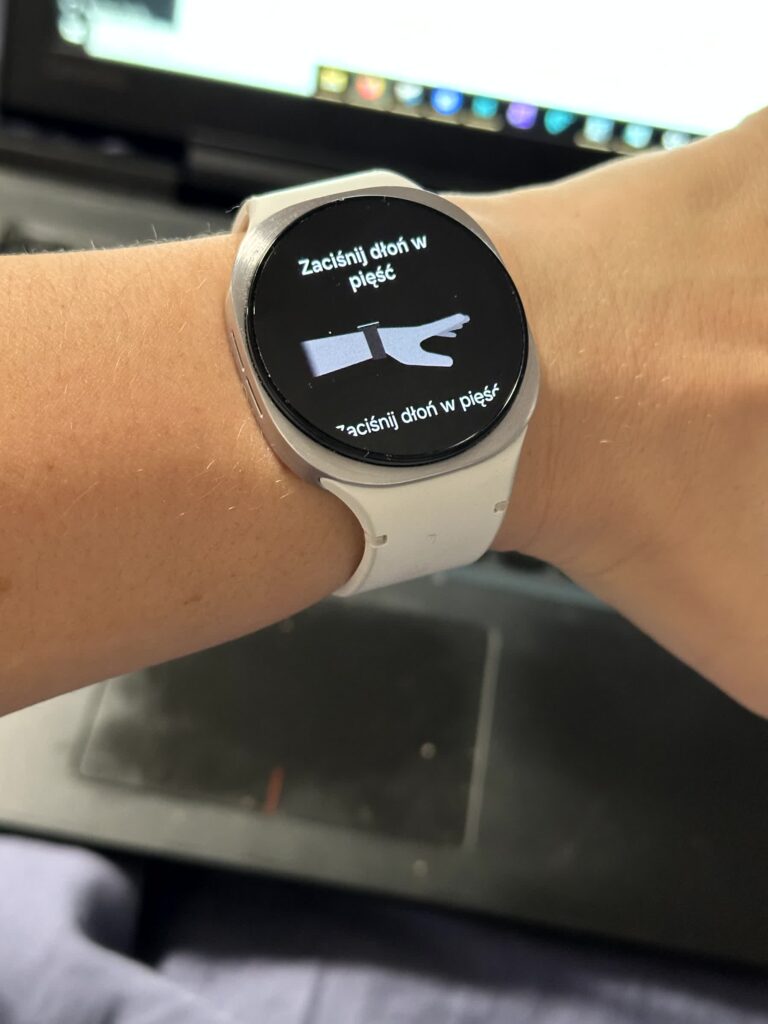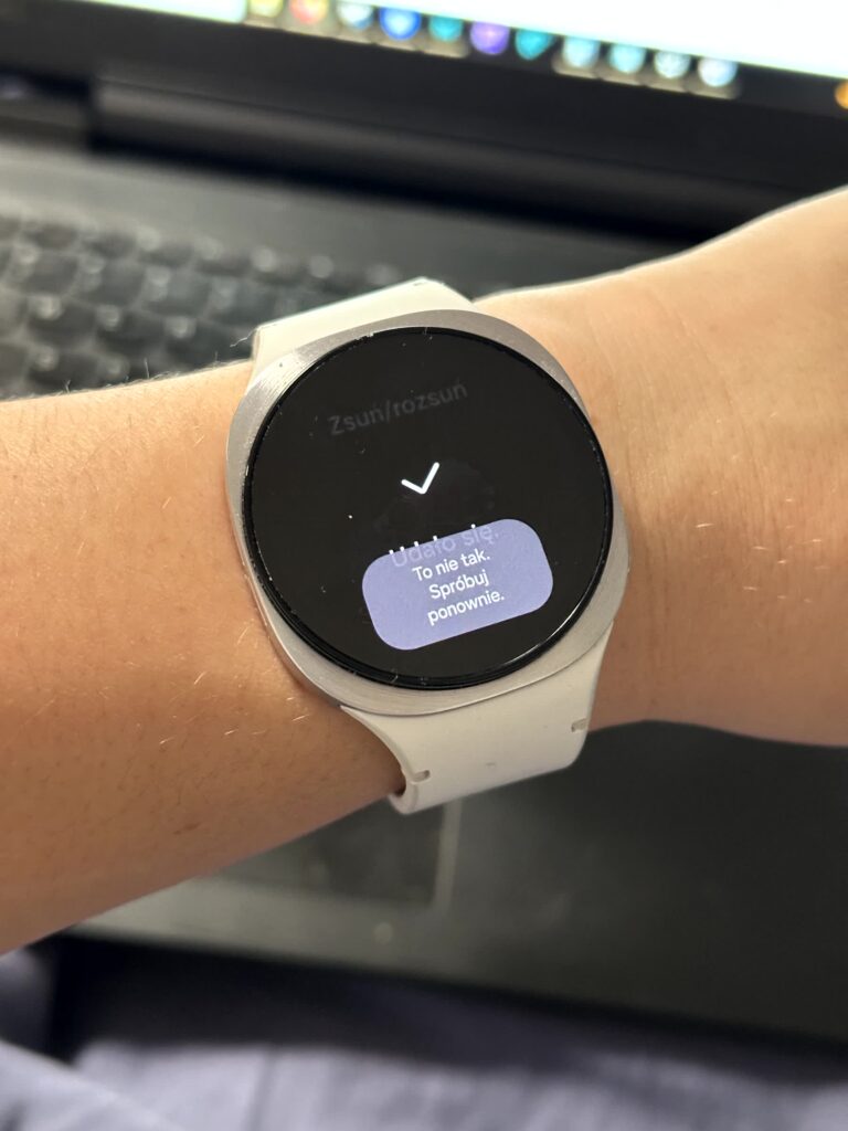 Niestety, funkcja wykrywania ciśnienia nadal wymaga telefonu Samsung i regularnej kalibracji tradycyjnym ciśnieniomierzem. Pomiary bywają niestabilne, więc traktuję je raczej jako ciekawostkę niż źródło wiedzy o zdrowiu. Dodatkowo, przez słabą baterię, miałam trudności z rzetelnym mierzeniem bezdechu sennego – zegarek rzadko dożywał do rana na moim nadgarstku.