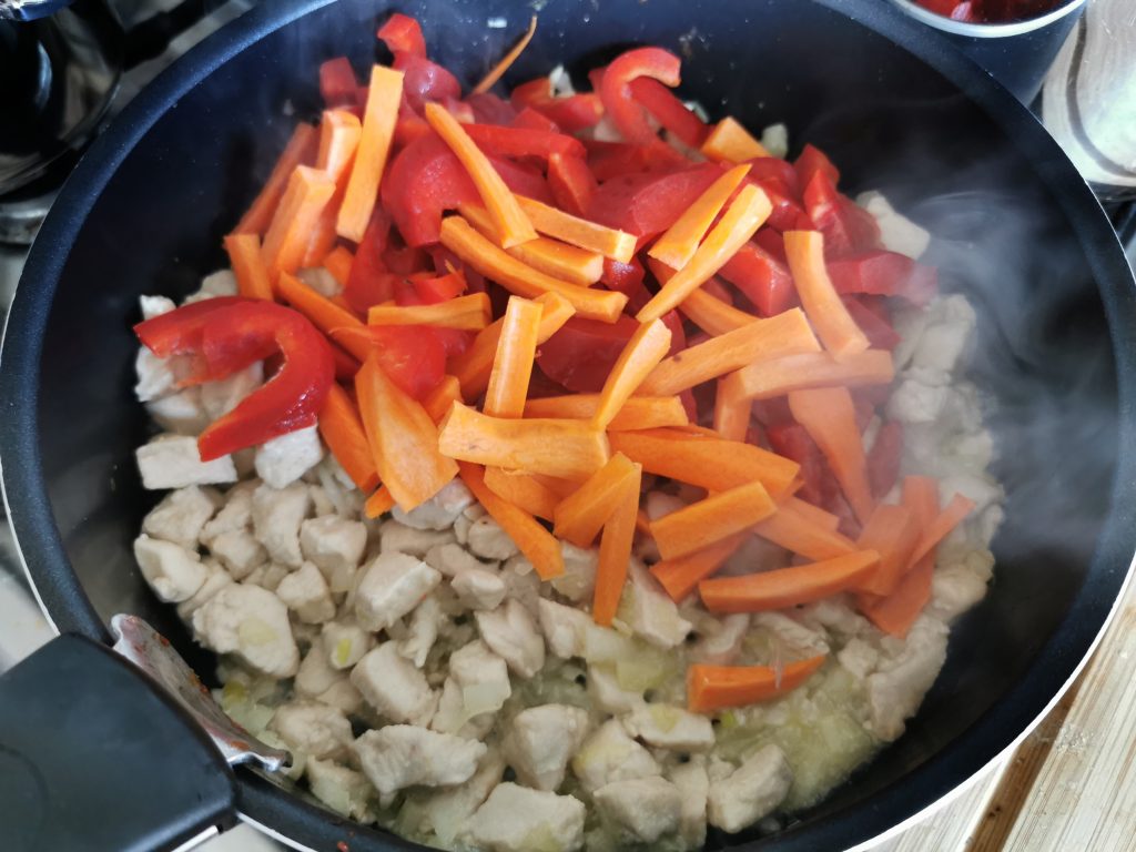 - Dodajemy pokrojoną paprykę i marchewkę. Smażymy kolejne ok. 5 min.