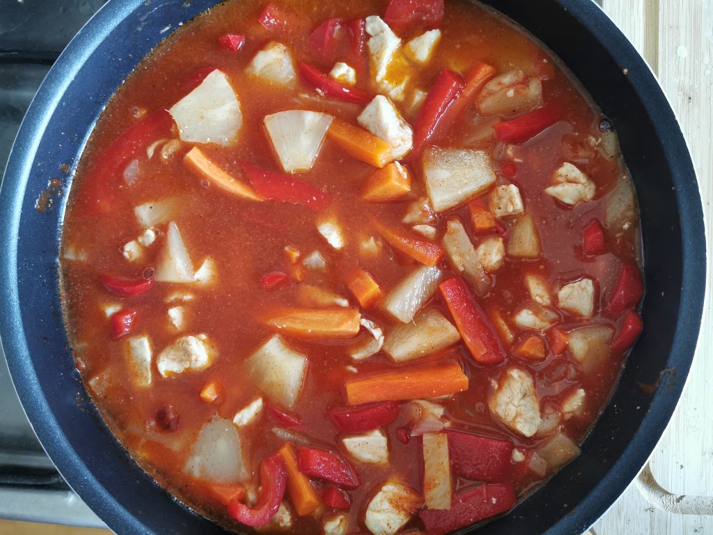 - Dorzucamy ananasa (pokrojonego) oraz przyprawy, keczup i sok z cytryny. Mieszamy, dajemy się wszystkiemu trochę pogotować.